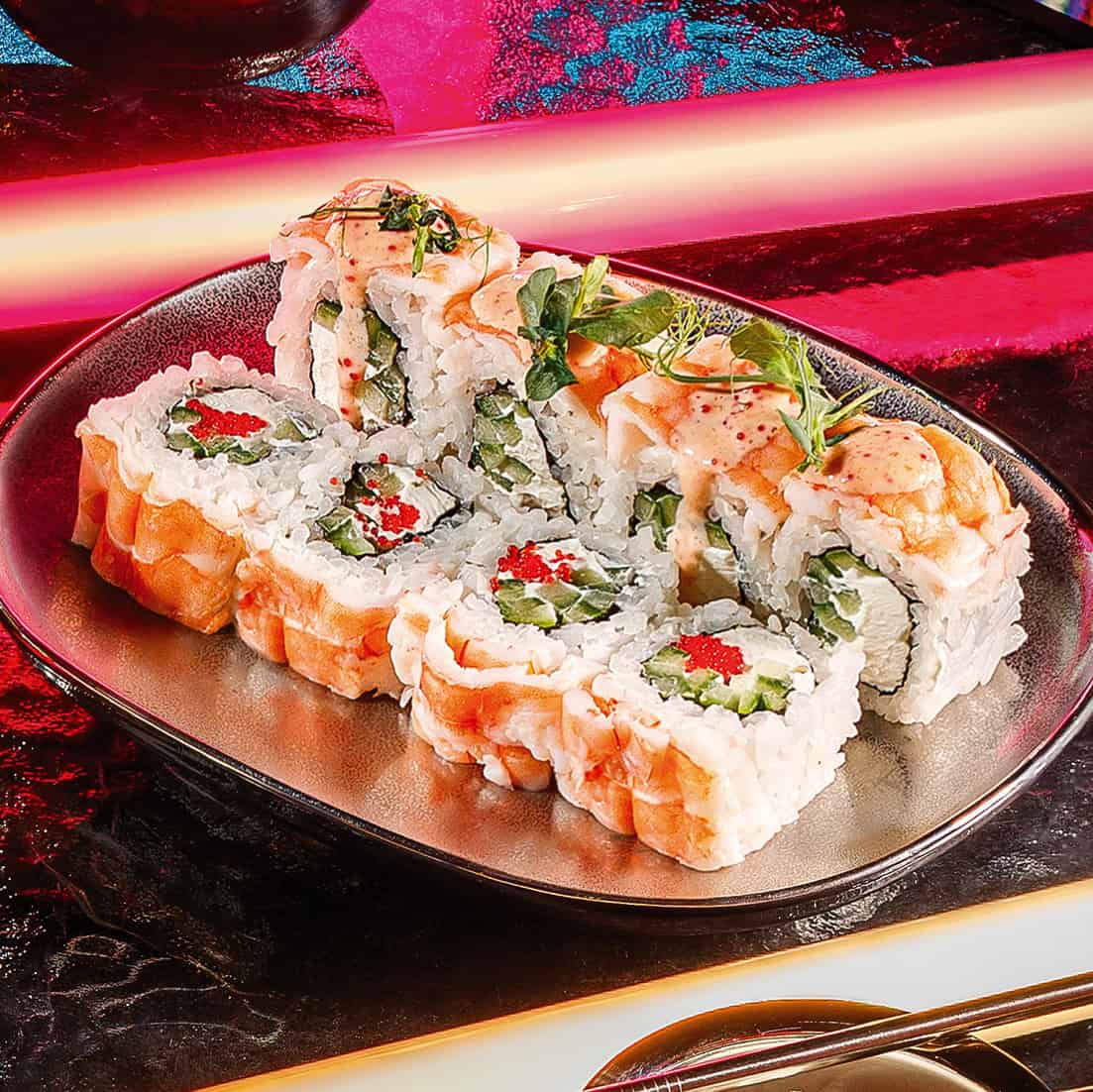 Ingrediente: Orez, Nori, Castraveti, Crema de branza, Tobiko, Creveti, Spicy sos (250 g)