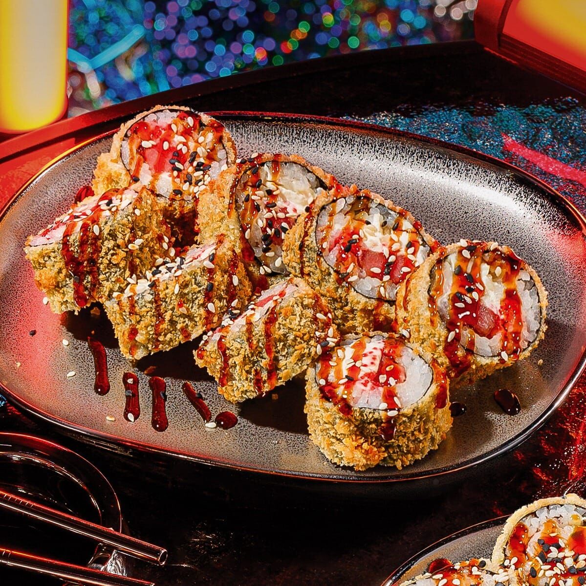 Ingrediente: Orez, Nori, Ton, Tobiko, Crema de Branza, Unaghi, Susan, Panko, Tempura (300 g)