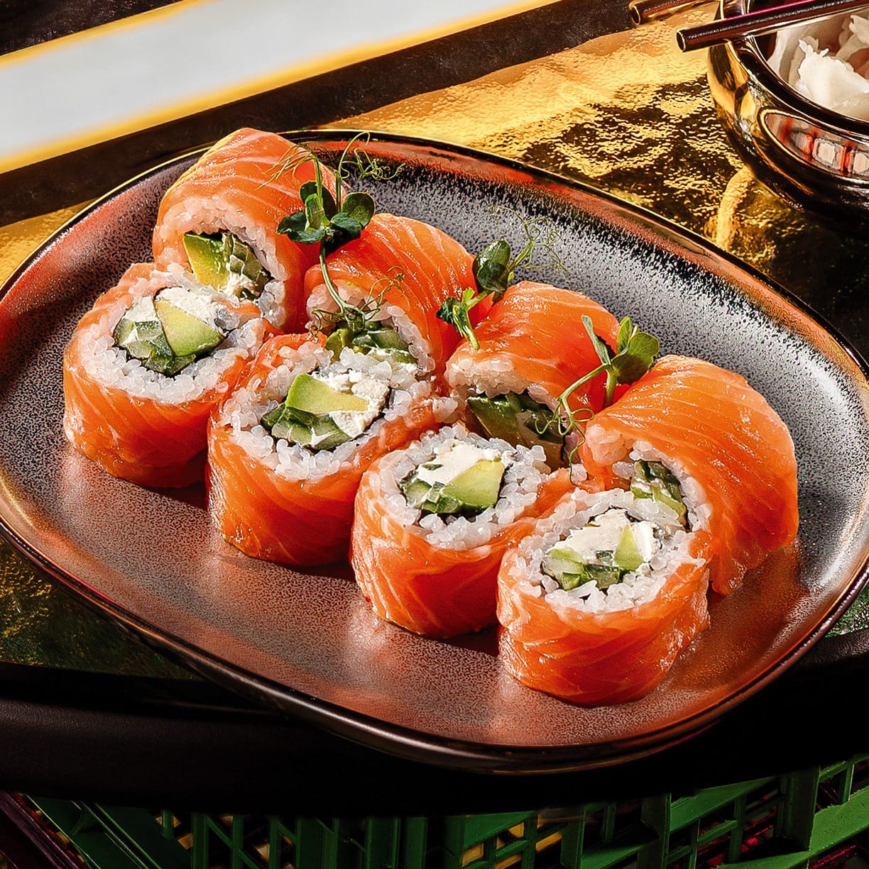 Ingrediente: Orez, Nori, Somon, Crema de branza, Avocado. – (260 g)